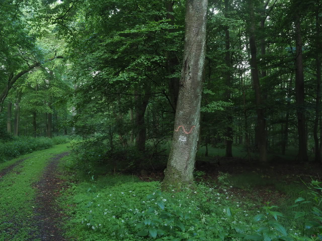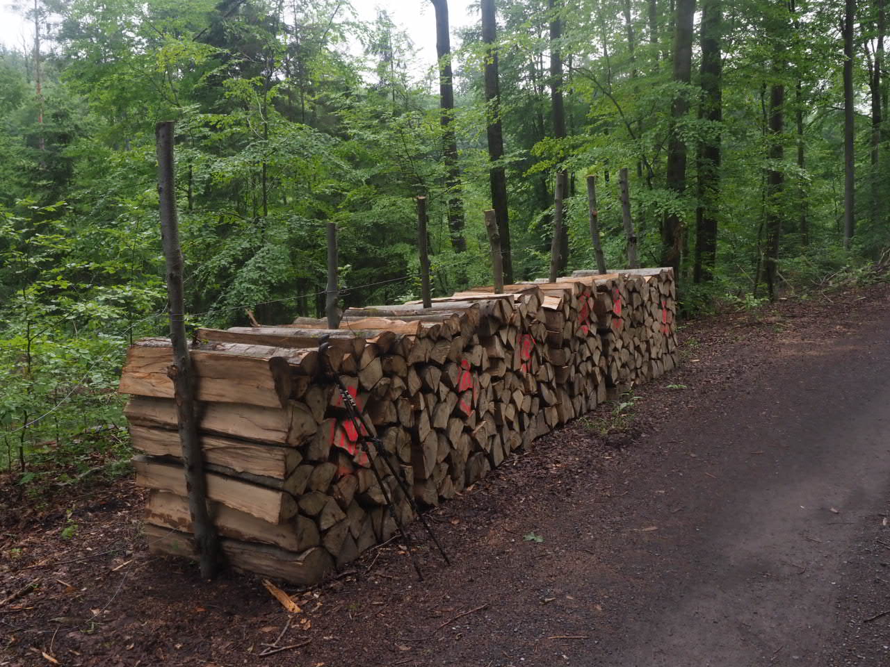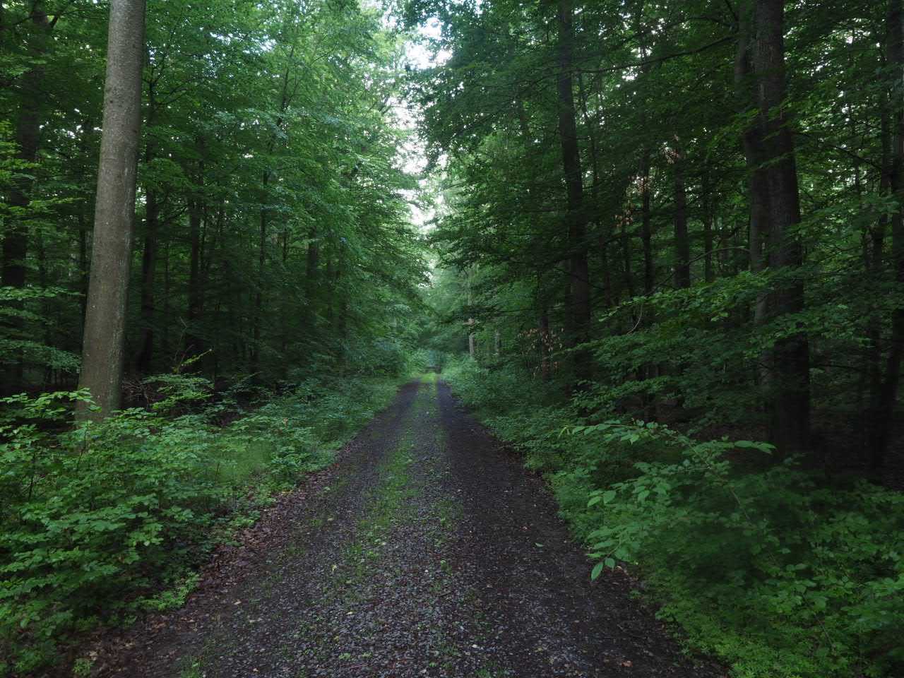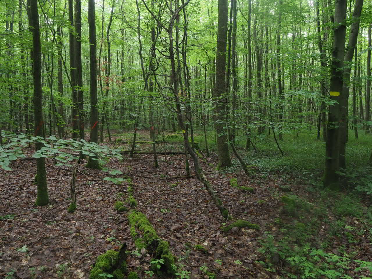 Es regnet abends nur wenig und früh am Morgen bin ich wieder unterwegs, durch die weiten, alten Laubwälder des Steigerwalds. Lediglich in Oberschleichach und Geusfeld verlasse ich kurz den Wald. Obwohl ich ja schon eine ganze Zeit durch Bayern wandere, ist dies das erste Mal, dass ich durch ein so großes, fast reines Laubwaldgebiet wandere. Zwar ist die Buche bestimmend, aber es gibt auch viele Eichen und zahlreiche Mischbaumarten von der Linde über die Esche, Ahorne, Aspen und Birken sorgen für einen sehr abwechslungsreichen Waldaufbau. Obwohl hier offensichtlich schon seit langem naturgemäß gewirtschaftet wird, machen die meisten Bestände einen ziemlich dichten, geschlossenen Eindruck, was gerade im Vergleich zu dem Rotenhanschen Wald gestern auffällig ist. Dennoch gibt es auch hier eine ganze Menge Kronenschäden, meist an Randbäumen, aber nicht ausschließlich. Auch Eichen sind betroffen. Ich bin schon jetzt schwer vom Steigerwald begeistert, den ich in den nächsten Tagen noch intensiver kennen lernen werde!