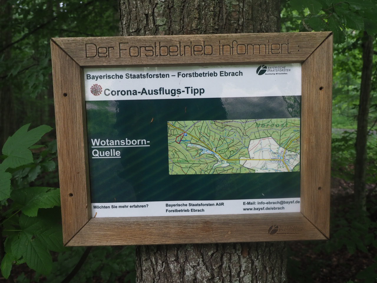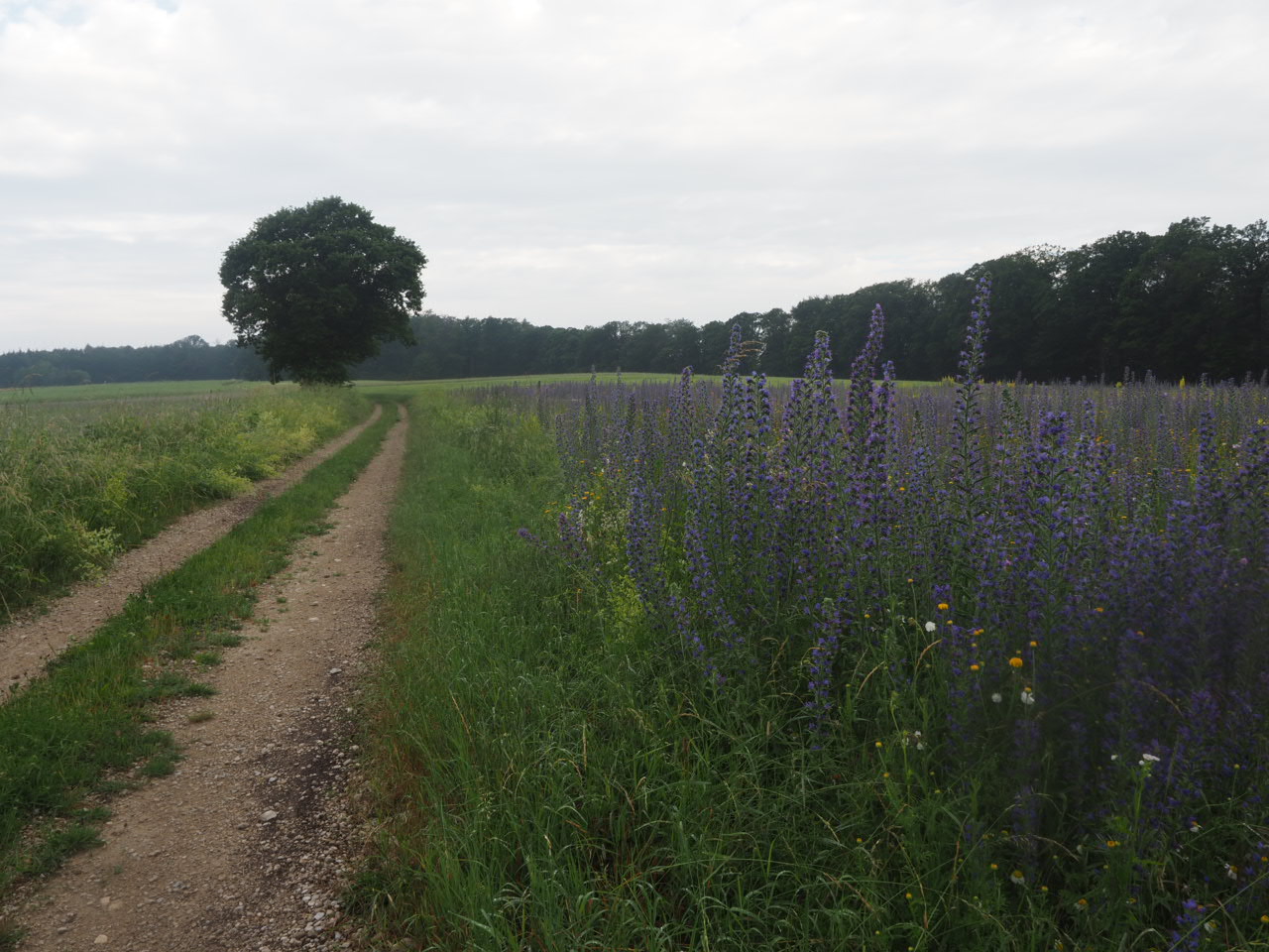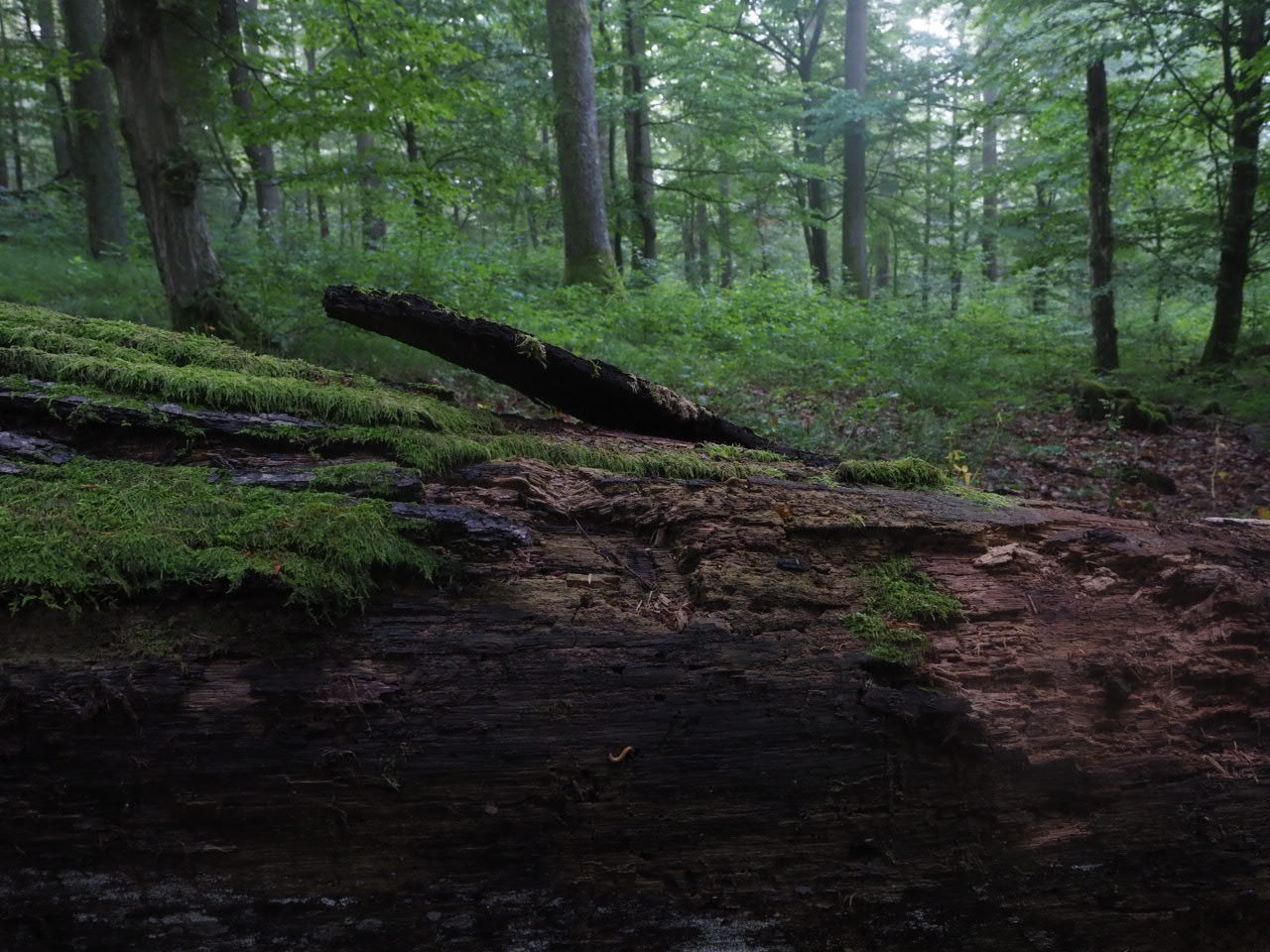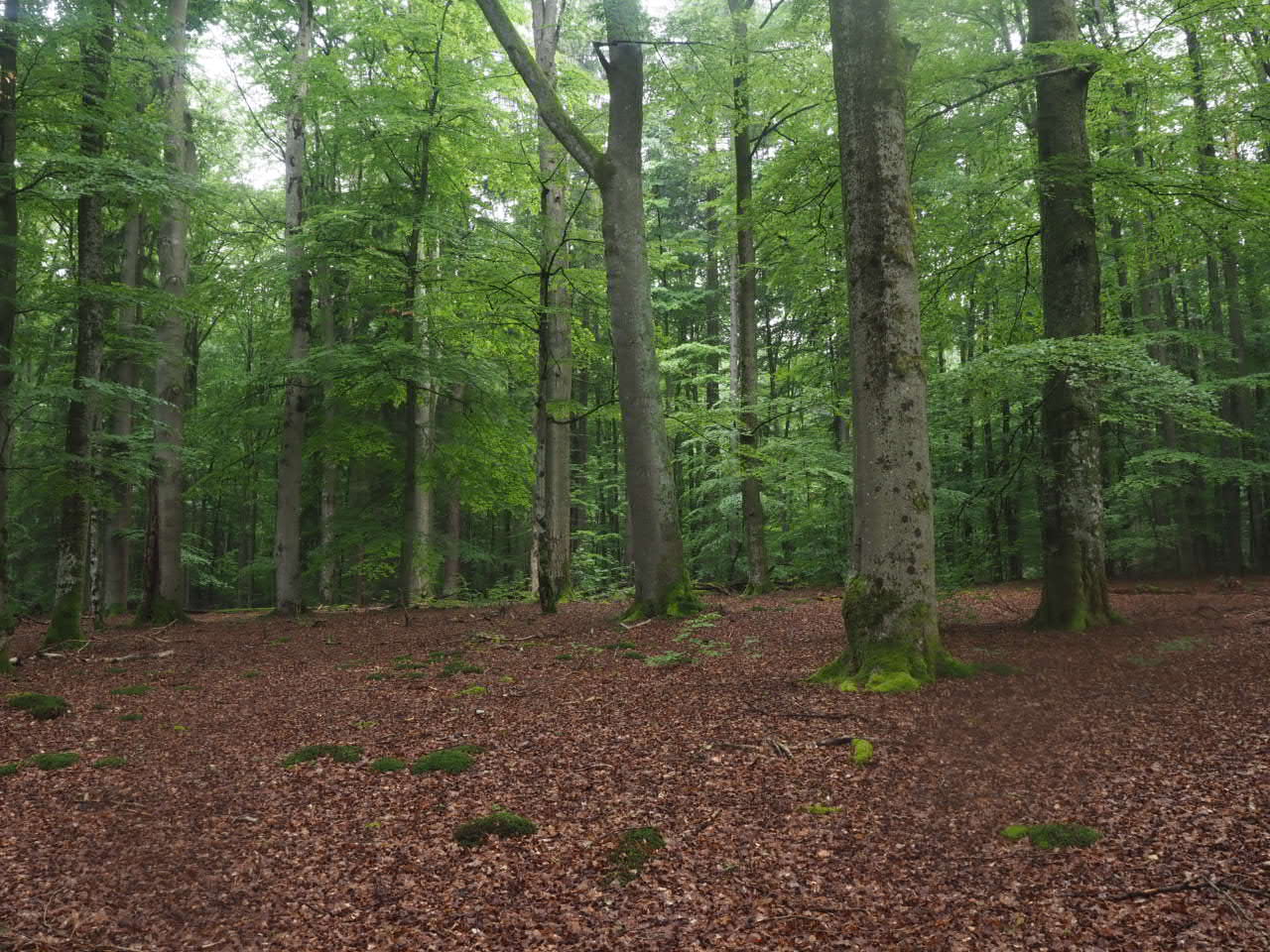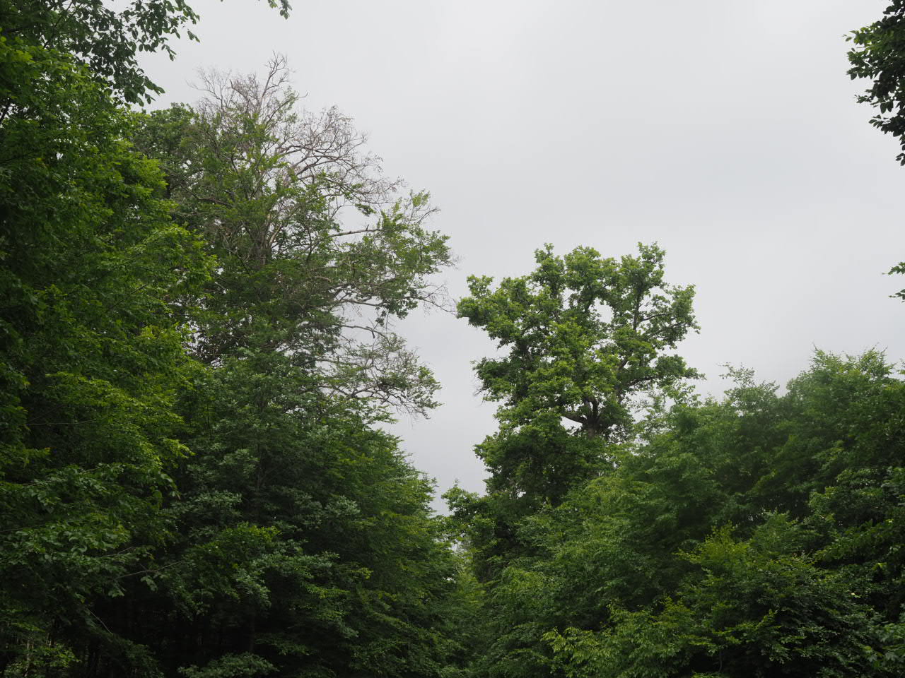 Es regnet abends nur wenig und früh am Morgen bin ich wieder unterwegs, durch die weiten, alten Laubwälder des Steigerwalds. Lediglich in Oberschleichach und Geusfeld verlasse ich kurz den Wald. Obwohl ich ja schon eine ganze Zeit durch Bayern wandere, ist dies das erste Mal, dass ich durch ein so großes, fast reines Laubwaldgebiet wandere. Zwar ist die Buche bestimmend, aber es gibt auch viele Eichen und zahlreiche Mischbaumarten von der Linde über die Esche, Ahorne, Aspen und Birken sorgen für einen sehr abwechslungsreichen Waldaufbau. Obwohl hier offensichtlich schon seit langem naturgemäß gewirtschaftet wird, machen die meisten Bestände einen ziemlich dichten, geschlossenen Eindruck, was gerade im Vergleich zu dem Rotenhanschen Wald gestern auffällig ist. Dennoch gibt es auch hier eine ganze Menge Kronenschäden, meist an Randbäumen, aber nicht ausschließlich. Auch Eichen sind betroffen. Ich bin schon jetzt schwer vom Steigerwald begeistert, den ich in den nächsten Tagen noch intensiver kennen lernen werde!