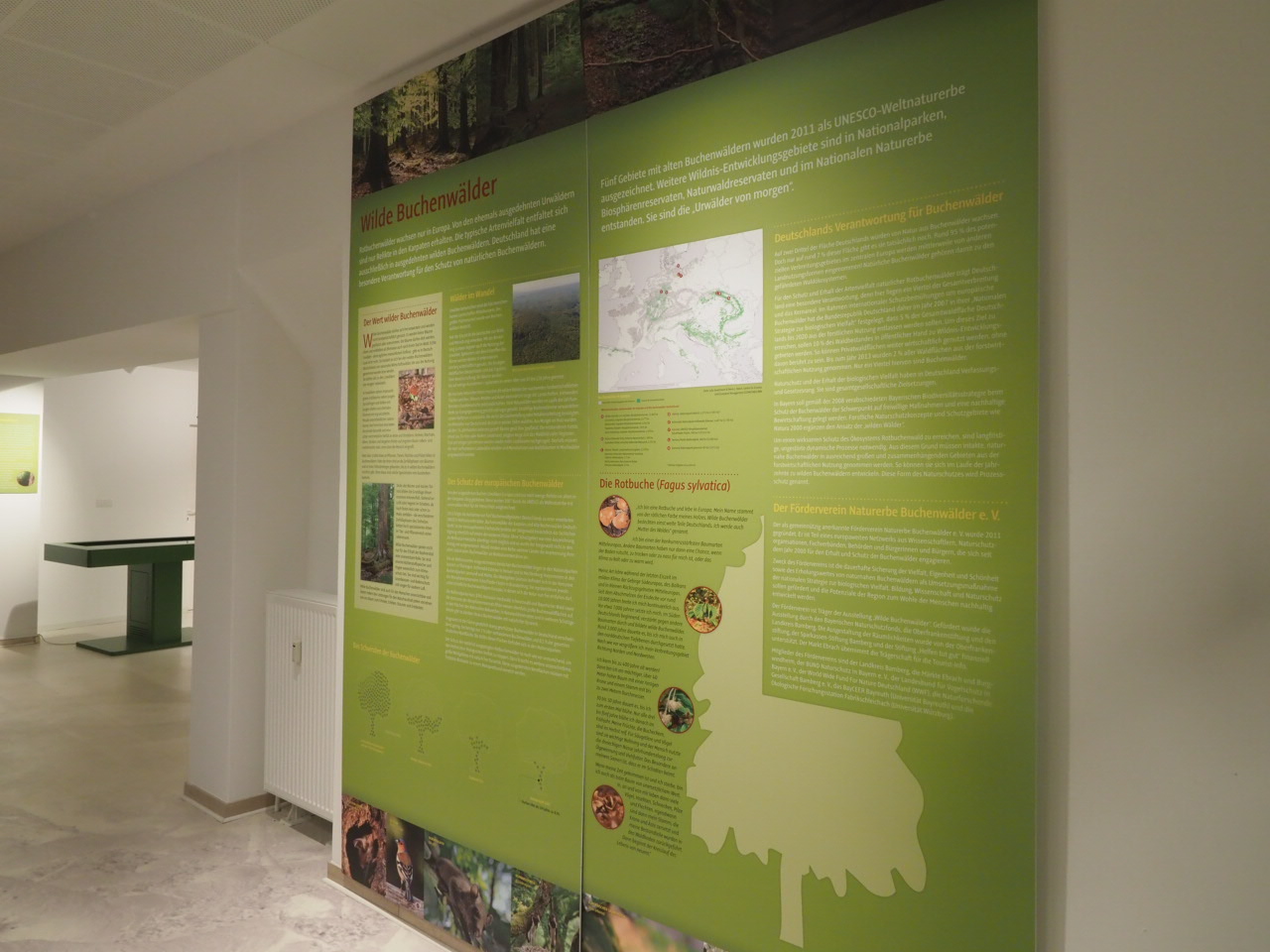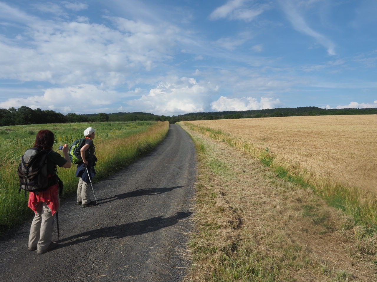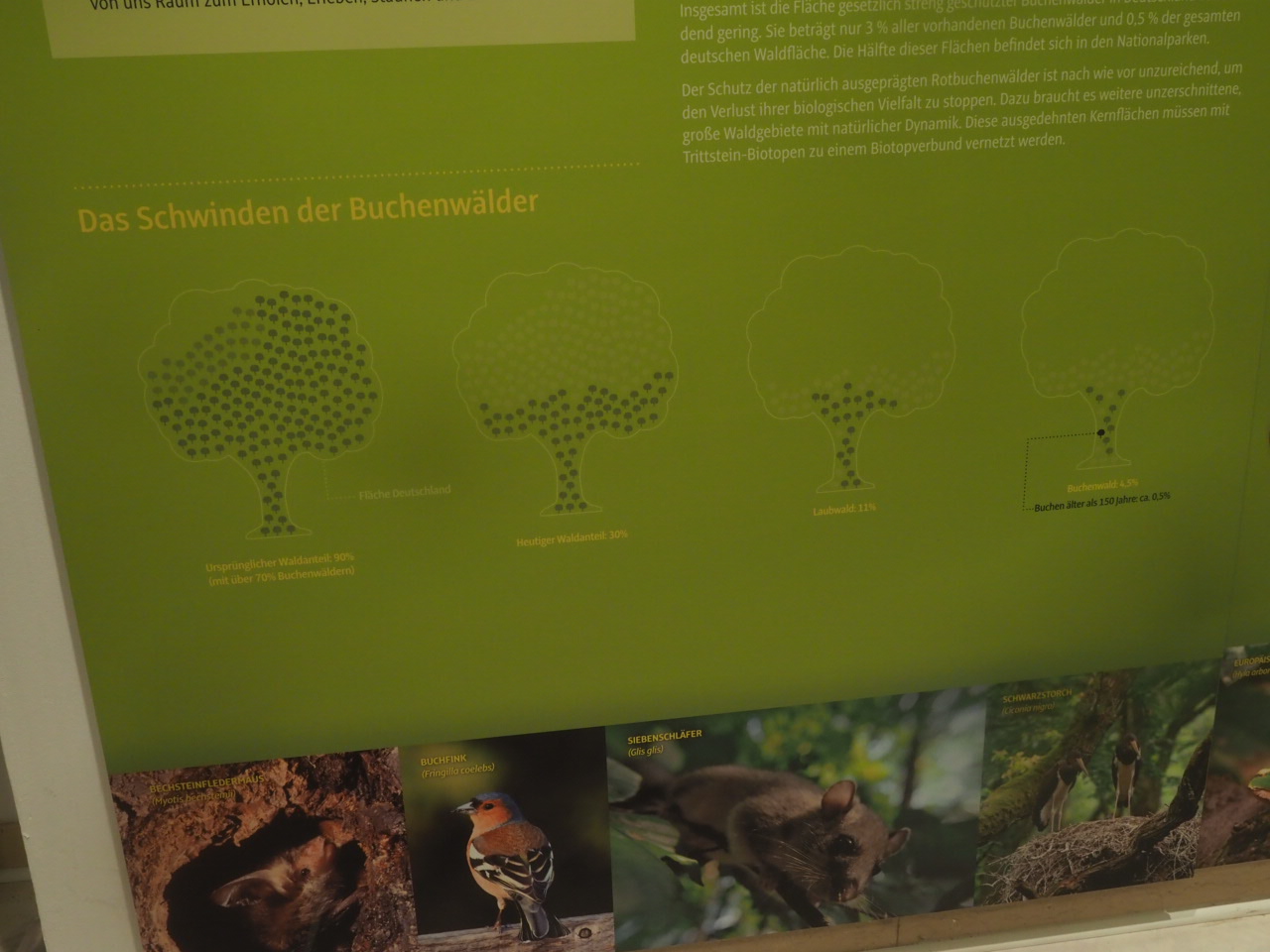 Georg könnte mir noch Tausend Sachen zeigen und ich ihm ewig zuhören, aber schließlich heißt es Abschied nehmen und ich wandere mit Ulla Reck, einer Tierärztin, die jetzt im Naturschutz arbeitet, und den gestrigen Termin organisiert hat, sowie ihrer Freundin Kim Weber weiter. Doch zuvor schauen wir uns kurz noch in Ebrach die sehr sehenswerte Ausstellung „Wilde Buchenwälder“ an. Noch einmal durchqeren wir den Steigerwald in Richtung Norden und gelangen schließlich bei Prüssberg an seinen Rand. Erstaunlich wie hier der Wald in Weinberge übergeht.