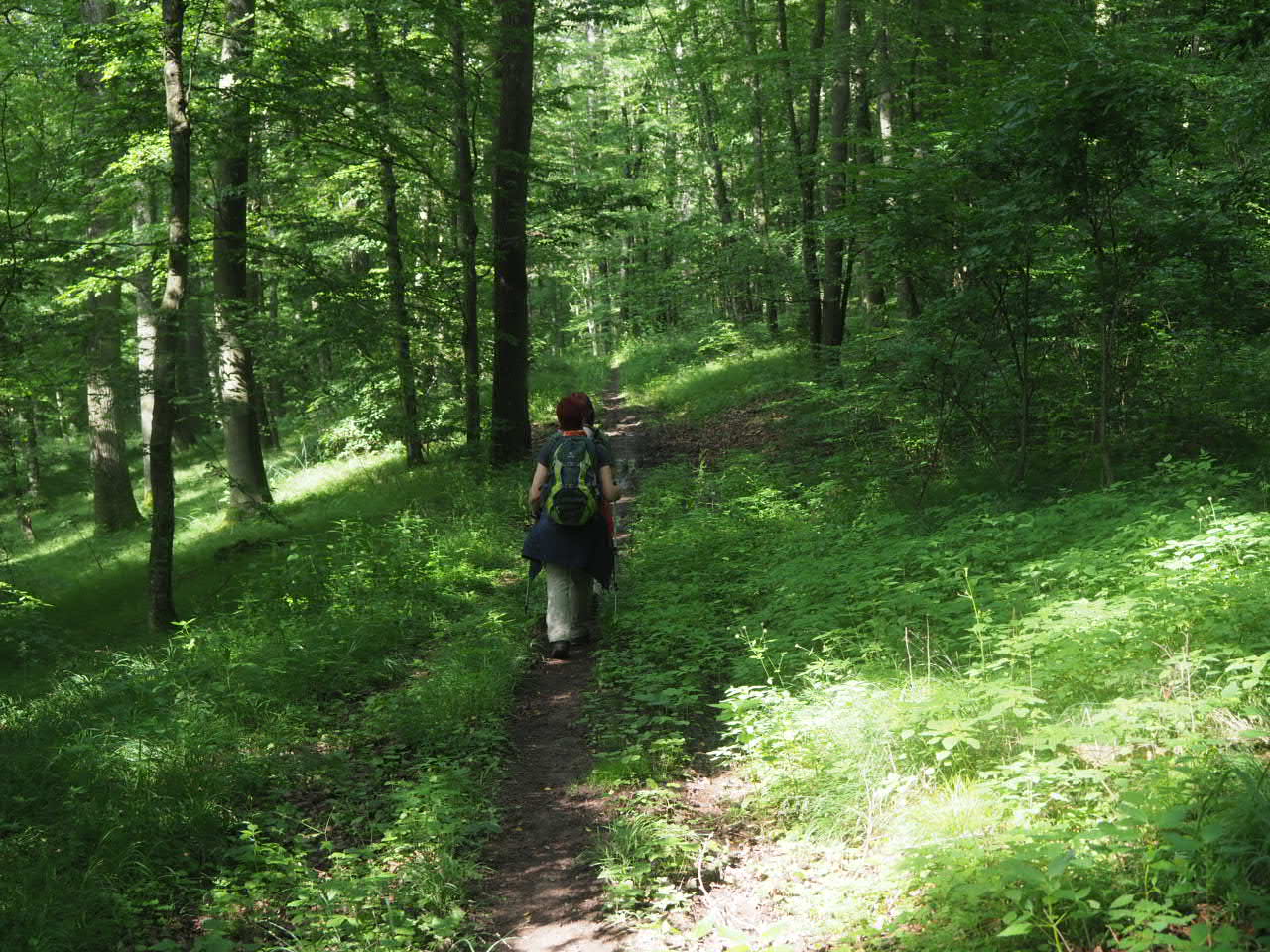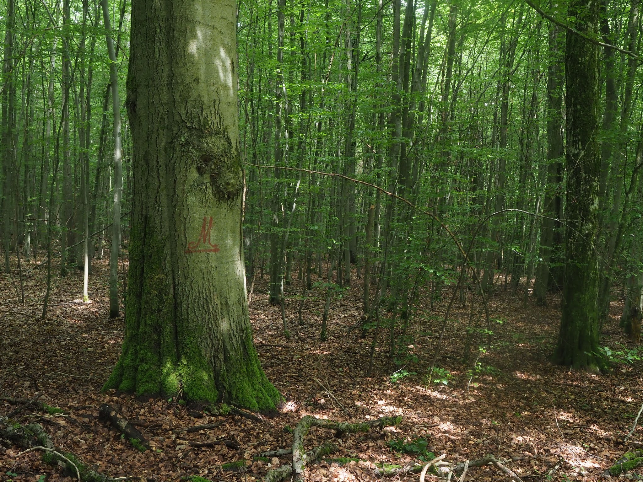 Zunächst fahren wir einige Meter bis zum etwa 50 Hektar großen Naturwaldreservat Brunnstube, in das wir dann laufen. Das sich die Wälder im Steigerwald heute noch so urwüschsig präsentieren, ist teilweise den Zisterziensermönchen des Kloster Ebrach zu verdanken, die den umliegenden Wald lange Zeit sehr schonend bewirtschaftet haben. So gab es hier für die örliche Bevölkerung kaum Nutzungsrechte, wie Streunutzung und Waldweide, die an vielen Orten den Wald stark devastiert haben.