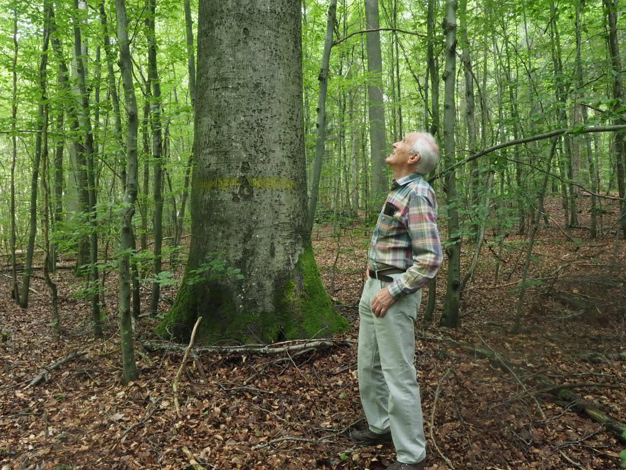 Selbst die Folgen große Trockenheit im Wald hat er schon nach 1976 gesehen. Nach diesem trockenen Jahr waren viele Buchen schwer erkrankt, und es gab Wissenschaftler, die dieser Baumart keine Zukunft mehr gaben, und wiederum die schnelle Beseitigung der alten Bestände empfahlen, was glücklicherweise relativ wenig umgesetzt wurde. Auf meine Frage, ob er es für sinnvoll hält, die Buchenbestände im Wirtschaftswald zur Zeit nur sehr vorsichtig zu nutzen, sagt er, dass er schon zu seiner Zeit wusste, wenn der Neuaustrieb in einem Bestand nach dem Wintereinschlag ins grün- gelbliche verfärbte, war man zu stark vorgegangen. Maximal 50 Festmeter pro Hektar ließ er einschlagen, kam aber bald zur Erkenntnis, dass zweimal 25, im Abstand einiger Jahre bestandesschonender sind, als 50 Festmeter in einem Eingriff.