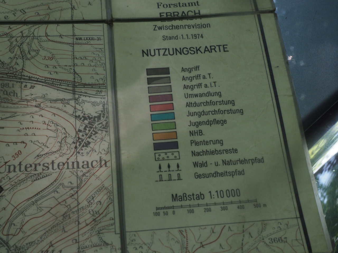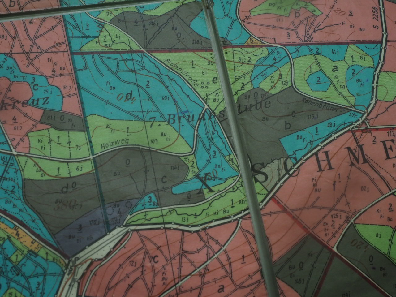 Georg Sperber übernahm 1972 das Forstamt. In dem Jahrzehnt zuvor waren hier noch 700 Hektar alte Laubwaldbestände kahl geschlagen und überwiegend mit Nadelbäumen bepflanzt worden. Dies sollte jetzt auf weiteren 500 Hektar geschehen, eine Praxis die er sofort zu seinem Amtsantritt beendete und das auch 20 Jahre lange durchhalten konnte, bis überall die Kahlschlagwirtschaft beendet wurde. Georg zeigt mir Karten aus dieser Zeit deren Vokabular regelrecht militärisch ist. So wird von „Angriff“ und „Teilangriff“ geschrieben, als Bezeichnung für die vorgesehenen Kahlschläge. Es ist nicht übertrieben zu sagen, dass hier regelrecht Krieg gegen den Wald geführt wurde! Oft wird von Forstleuten betont, dass der Zustand des Waldes aus lange zurück liegenden Entwicklungen resultiert, was oft auch richtig ist, allerdings ist es erstaunlich wie lange und in welcher Intensität in Deutschland noch bis in jüngste Zeit die alten Laubwälder, unser wichtigstes Naturerbe vernichtet wurden. So etwas darf sich heute unter dem Deckmantel des Umbaus der von manchen als nicht „klimastabil“ angesehenen Buchenwälder auf keinen Fall wiederholen!