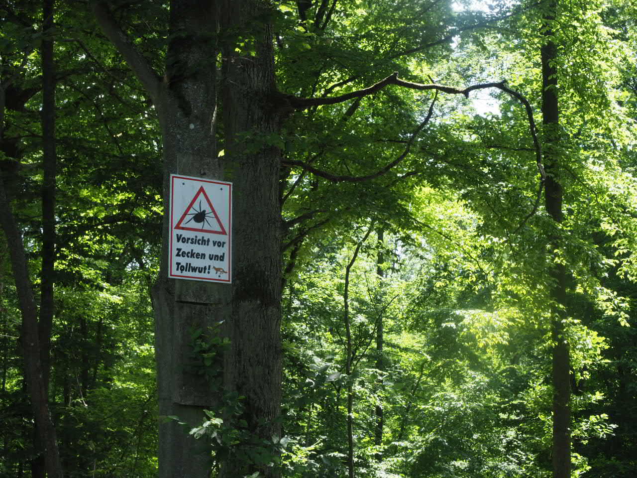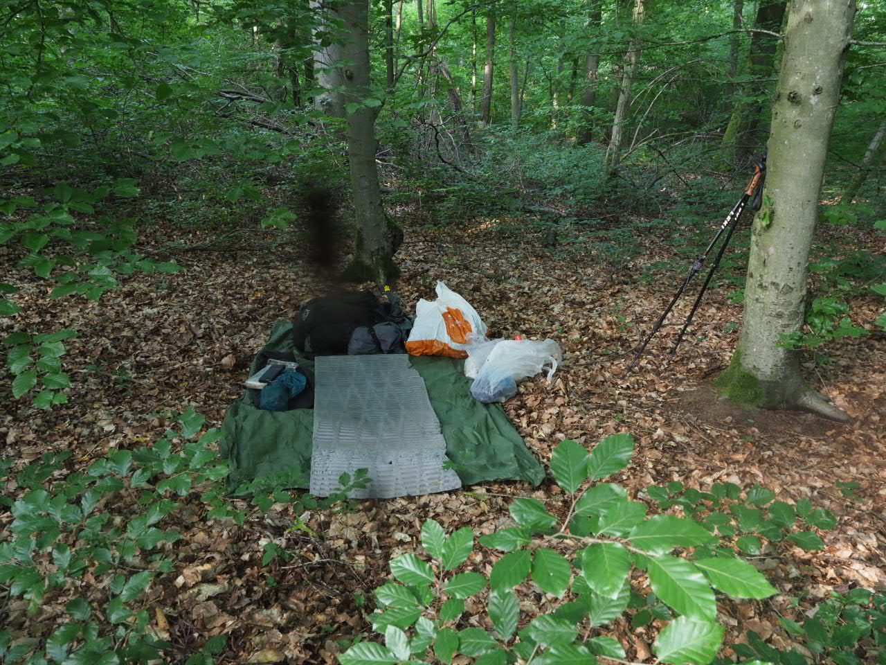 Leider habe ich nur noch einen halben Liter Wasser, aber der Bach an dem ich vorbei komme, sieht überhaupt nicht einladend aus, obwohl Blauflügelige Prachtlibellen auf Schilfhalmen sitzen. Schließlich suche ich mir einen Platz in einem Mischbestand aus Buchen, Eichen, Hainbuchen und Lärchen und stelle mich auf eine durstige Nacht ein. Wie gestern Abend auch, wimmelt es von Mücken. Da ich weder ein chemisches Abwehrmittel, noch ein Moskitonetz benutze, hoffe ich, dass die meisten Quälgeister bei Einbruch der Dunkelheit verschwinden und übe mich in Geduld.