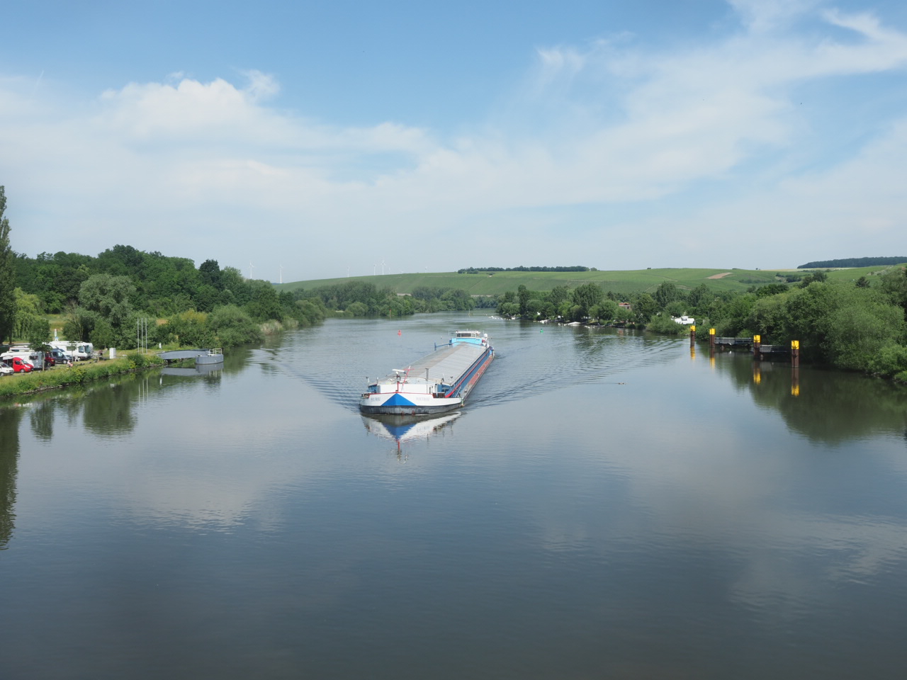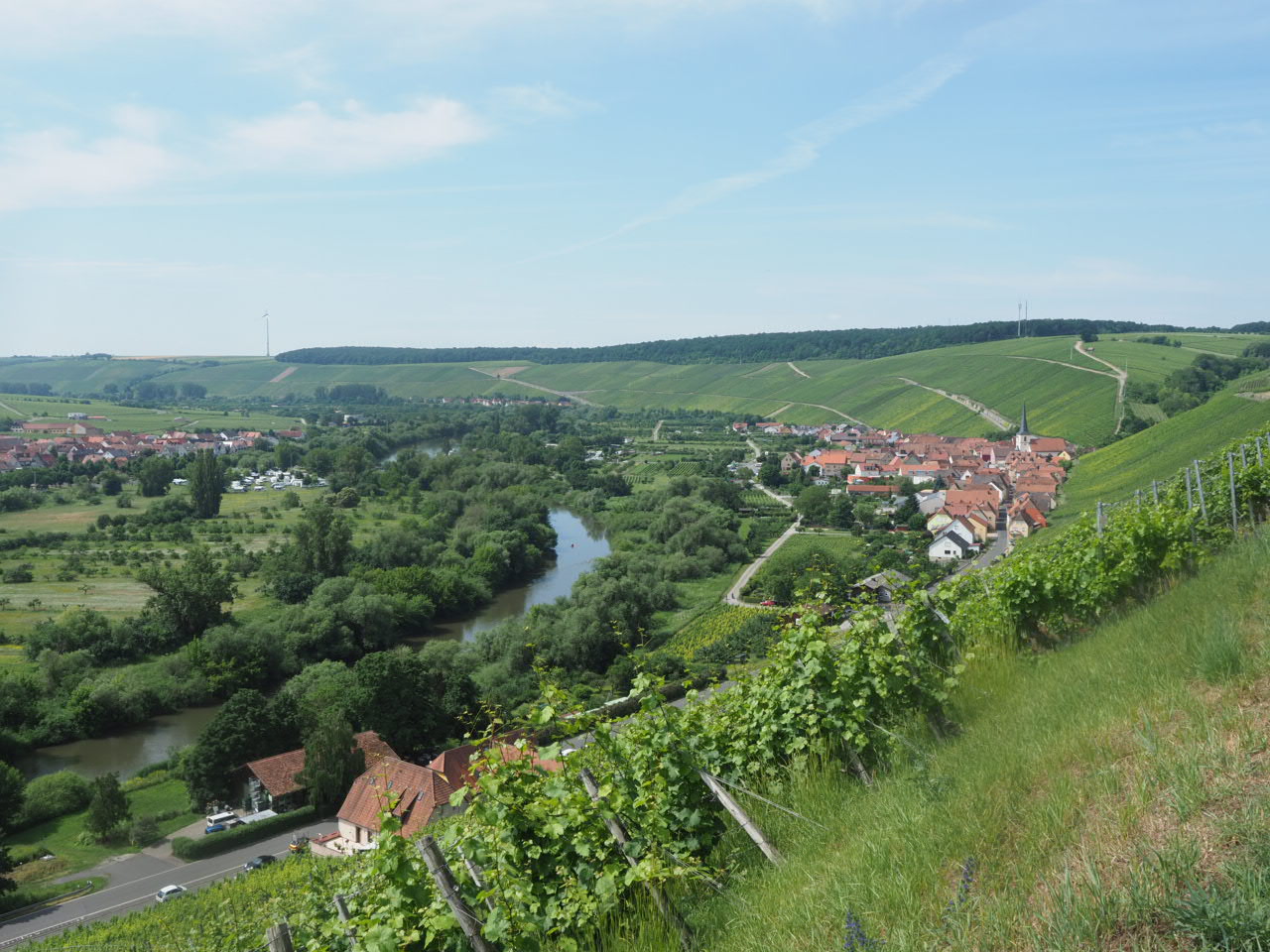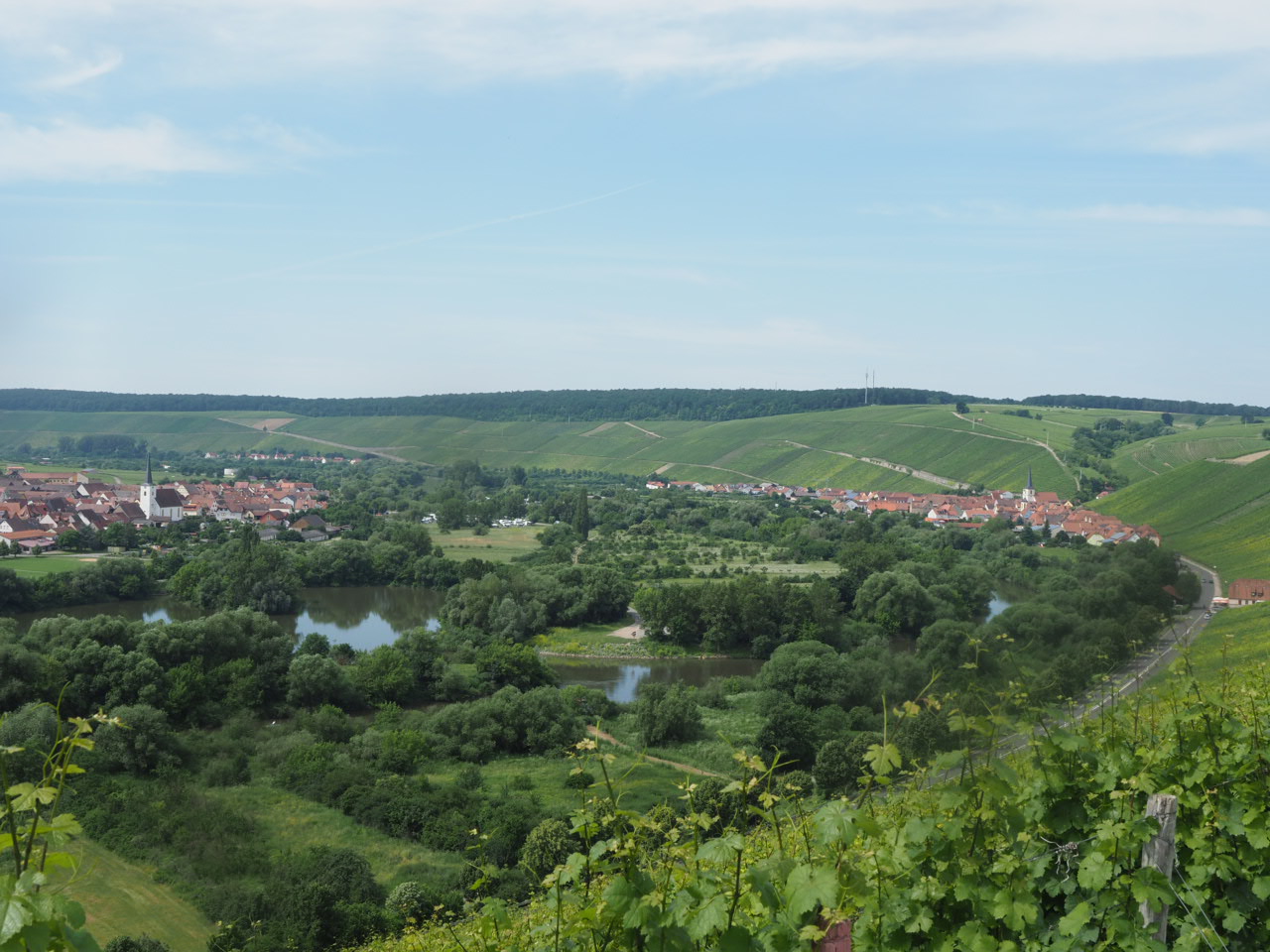 Erst nach sieben breche ich auf und wandere an einem Teichgebiet vorbei lange durch weite Felder. Immerhin sehe ich hier einige Hasen und sogar zwei Rebhühner. Vor Volkach beginnen dann die Weinberge. Da heute ein Sonntag mit schönem Wetter ist, sind viele Leute unterwegs. Einige Zeit wandere ich durch die Weinberge über dem Main. Die Szenerie ist ganz nett, kommt jedoch nicht an Rhein oder Mosel heran.
