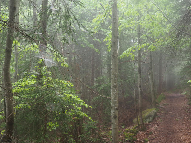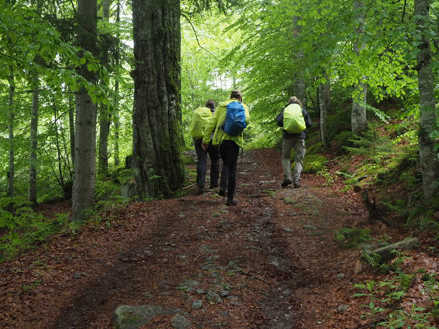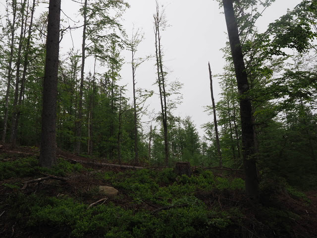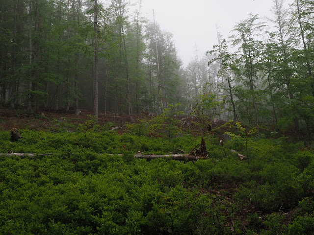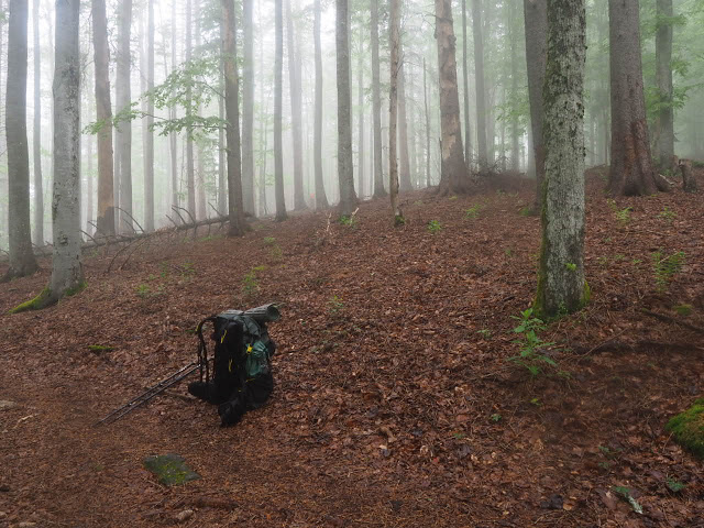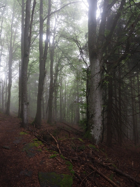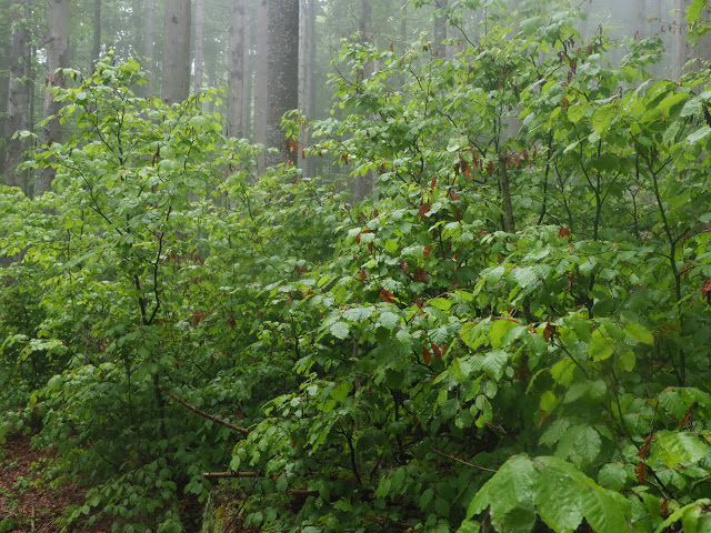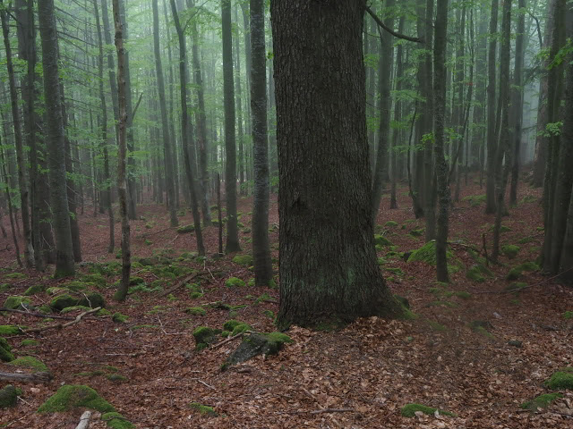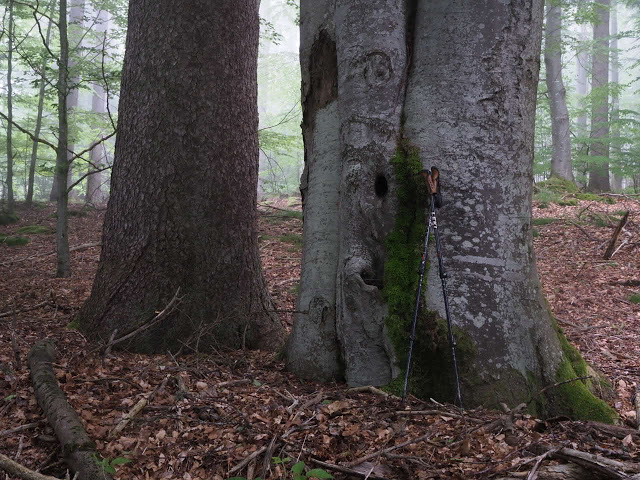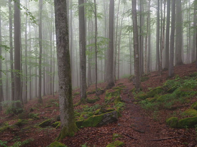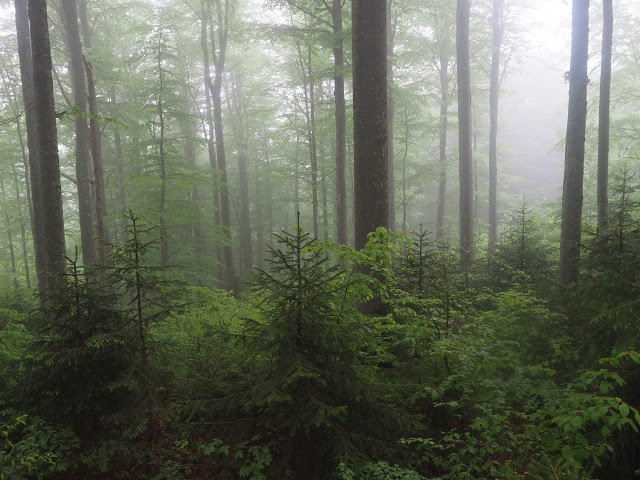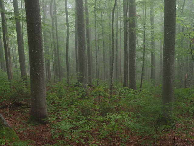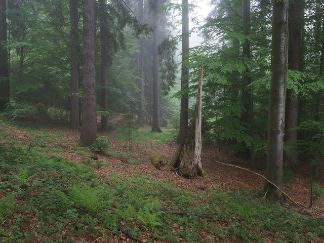 Obwohl es in der Nacht heftig gewittert, bleibt es bei mir trocken. In dunstigem Waschküchenwetter, das bald in Nieseln übergeht, bin ich schon früh wieder unterwegs. Der Wald hier wird offenbar plenterartig bewirtschaftet. An den vielen dicken Tannen und Buchen kann ich mich kaum satt sehen, aber auch die Buche ist immer mit dabei, toll!