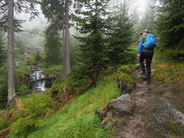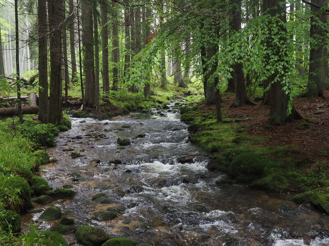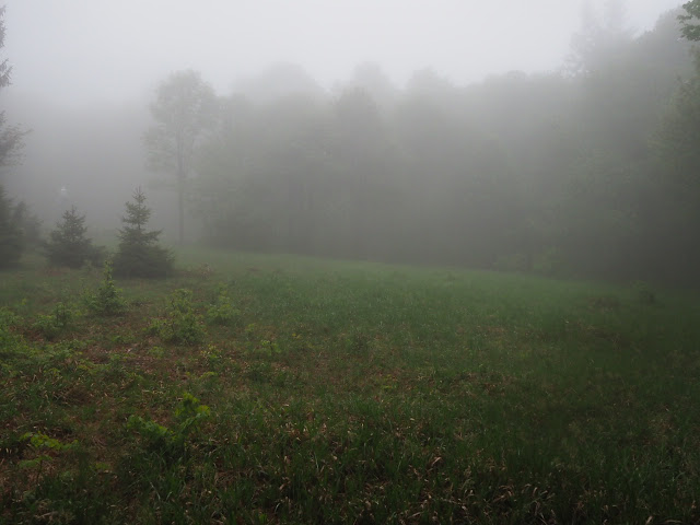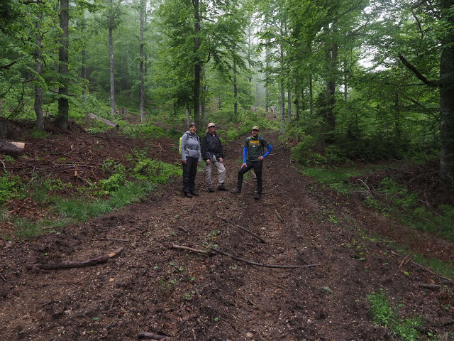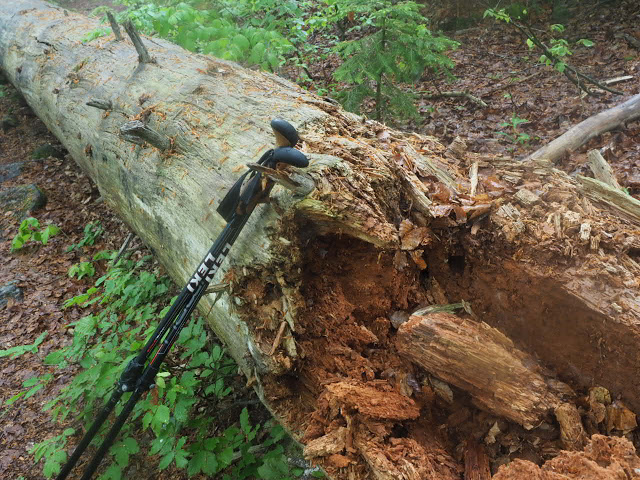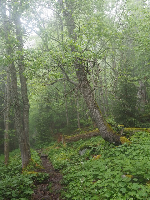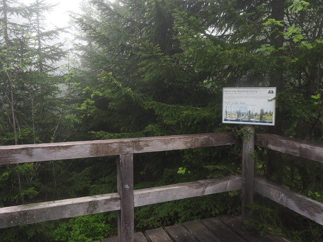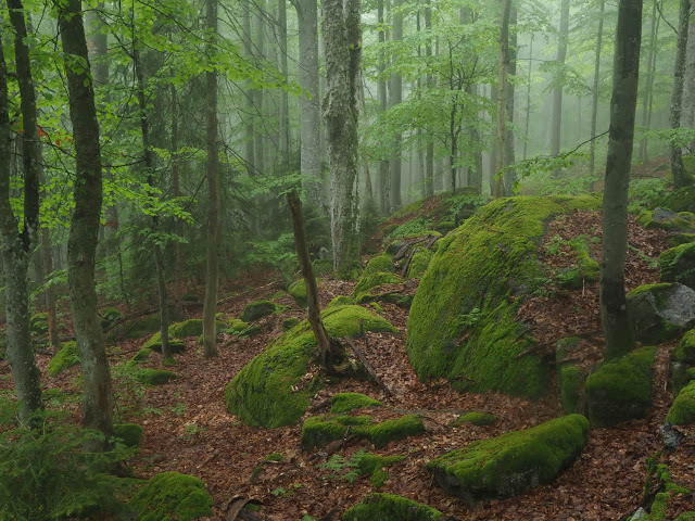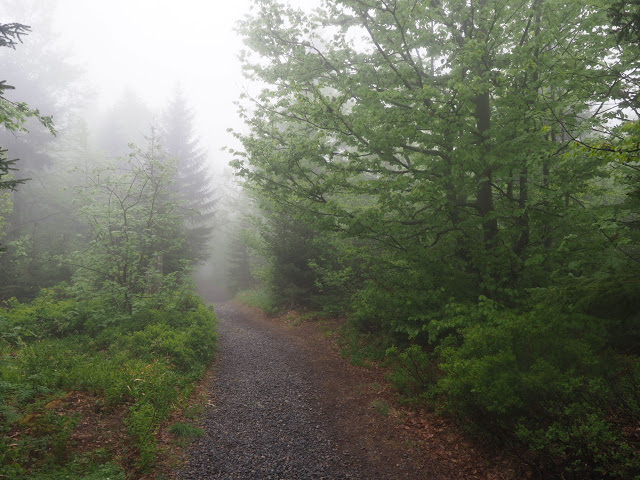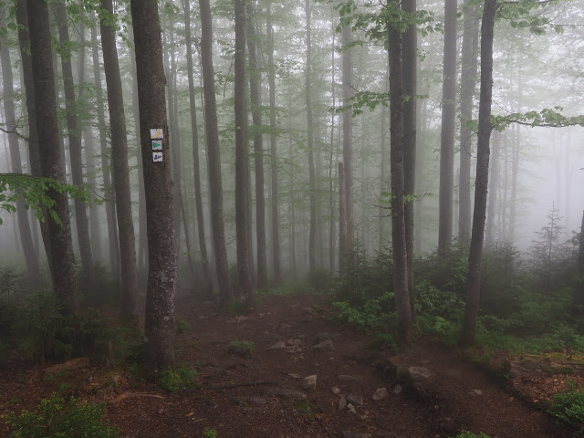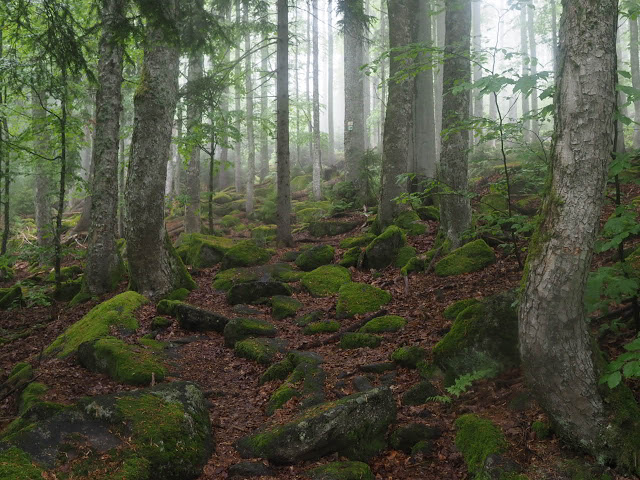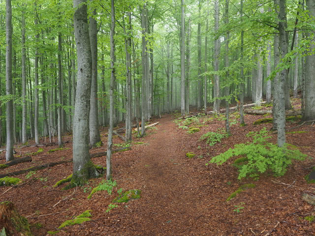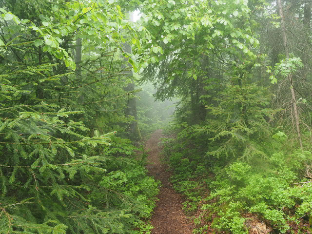 Obwohl es in der Nacht heftig gewittert, bleibt es bei mir trocken. In dunstigem Waschküchenwetter, das bald in Nieseln übergeht, bin ich schon früh wieder unterwegs. Der Wald hier wird offenbar plenterartig bewirtschaftet. An den vielen dicken Tannen und Buchen kann ich mich kaum satt sehen, aber auch die Buche ist immer mit dabei, toll!