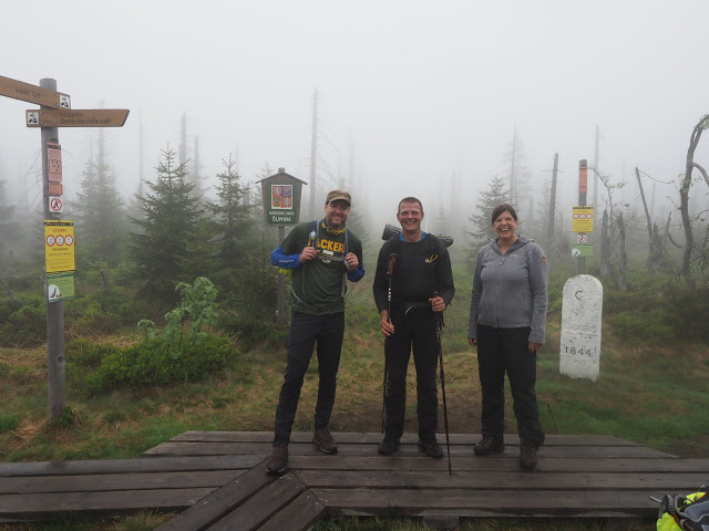 An der Reschbachhütte essen wir von Astrid mitgebrachte Muffins und trinken Kaffee, anschließend geht es recht steil bergauf. Hier war der Wald auf Grund der Borkenkäferkalamität in den 90’er Jahren großflächig abgestorben, hat sich aber grandios erholt. Auch die nächste Generation in der Höhe über 1100 Meter besteht überwiegend aus Fichten, die aber viel lockerer wachsen, als in einem gepflanzten Wald und viel Raum beispielsweise für Ebereschen lassen. An der tschechischen Grenze erinnert ein Schild an den Nationalpark Šumava auf der anderen Seite, der doppelt so groß ist wie der Deutsche! Ein für mitteleuropäische Verhältnisse riesiges, sich entwickelndes Wildnisgebiet!