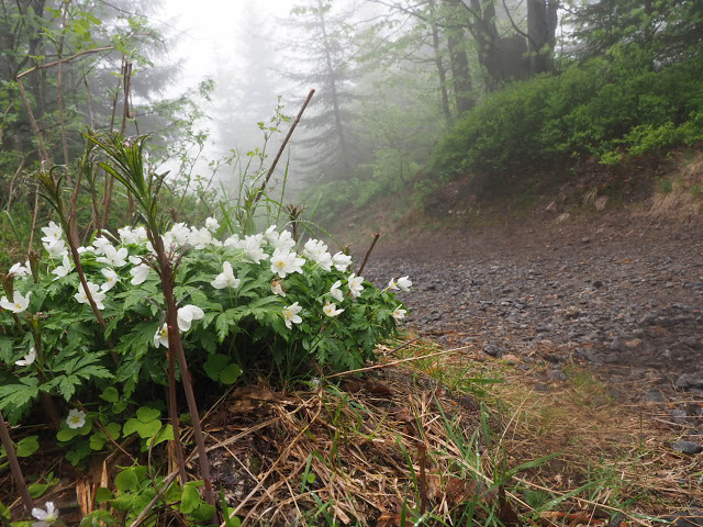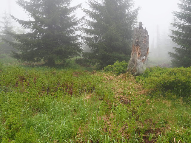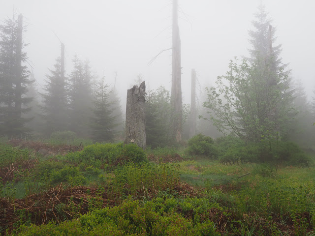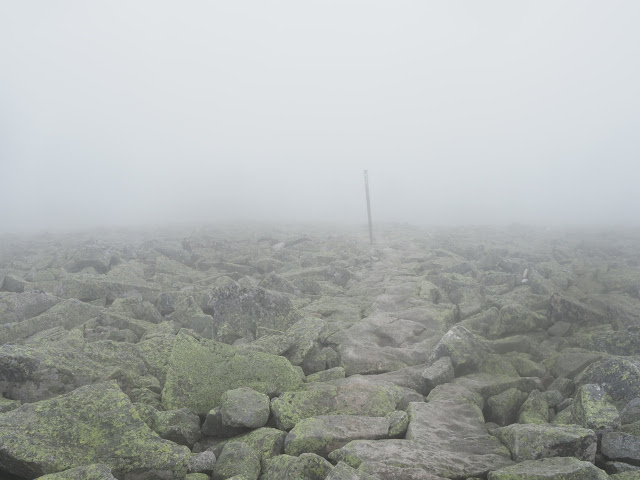 Vor dem Gipfel wachsen Latschen wie in den Alpen. Leider ist es zu neblig für einen Ausblick, der ansonsten grandios wäre, denn hier oben gibt es eine große, kahle Blockschutthalde. Nachdem wir noch Fotos und Videos aufgenommen haben, setze ich meinen Weg alleine fort. Obwohl heute Sonntag ist, begegnen mir nur zweimal Leute!