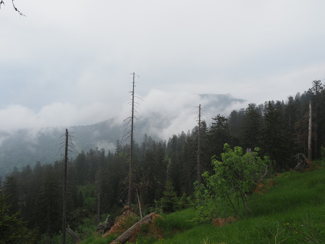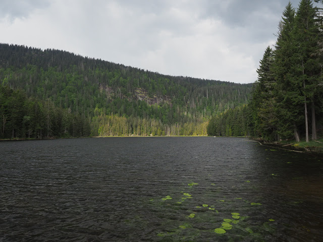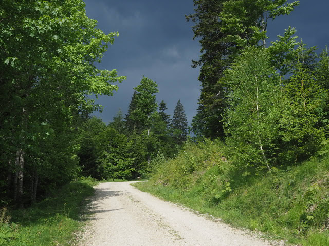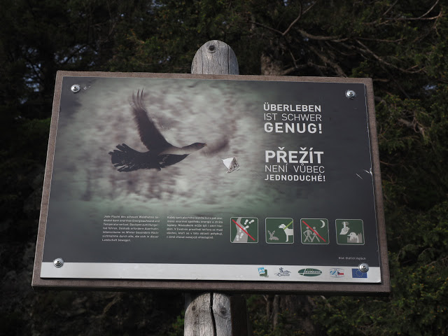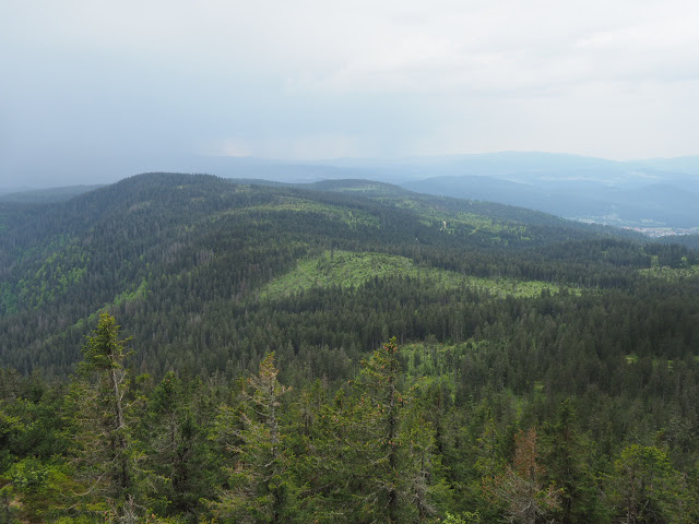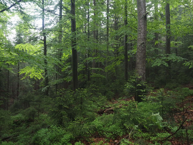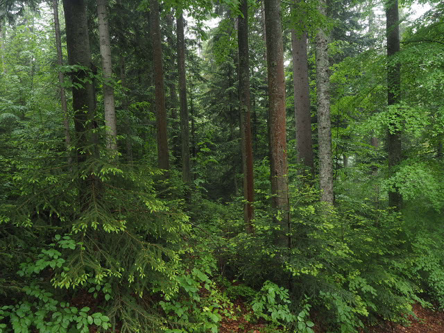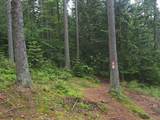 Da Peter und ich morgens noch zusammen frühstücken und uns wie immer gut unterhalten, breche ich erst gegen 8 Uhr auf. Ich folge dem Schwellkanal durch wunderschönen Wald zum Schwellhäusel. Ab dort geht es auf Forstwegen stetig aufwärts. Obwohl es noch früh am Morgen ist, zieht bereits ein Gewitter auf. Kurz nachdem ich den Arbersee passiert habe, beginnt es dann relativ stark zu regnen. Es donnert auch, aber das Gewitter entlädt sich glücklicherweise nicht über mir. Hier im fürstlich Hohenzollernschen Wald fallen mir Holzschilder mit plakativen Slogans auf, die zweifellos auf den benachbarten Nationalpark zielen : „Aktive Waldbewirtschaftung schafft stabile Wälder“. In naturgemäß arbeitenden Betrieben trifft das auch zu, aber man schaue sich die Fichtenmonokulturen im Wirtschaftswald an, die immer wieder kehrend von Stürmen und Borkenkalamitäten erschüttert werden, und man sieht, das dieser Spruch nicht so ganz zu trifft. Auf den Nationalpark bezogen muss man wissen, dass Störungen Vielfalt erzeugen, und ganz natürlich sind. Ja, viele Arten sind sogar daran angepasst. Über längere Zeiträume gesehen sind Ökosysteme häufig nicht stabil, aber das ist Teil der Natur, und diese Dynamik muss man in einem Nationalpark zulassen, der ja in erster Linie natürliche Prozesse schützen soll.