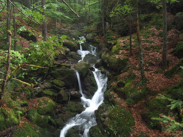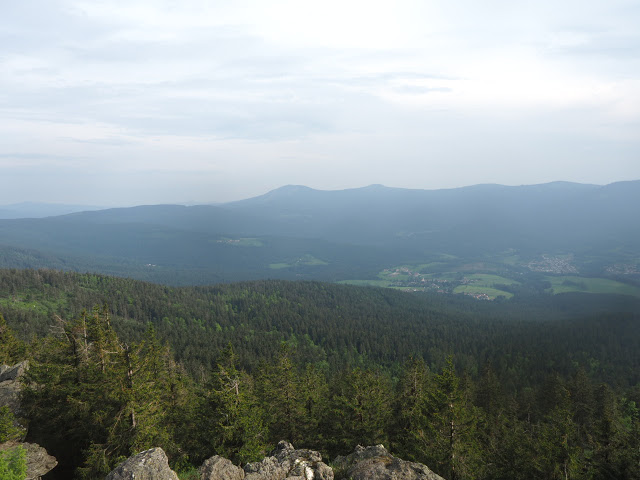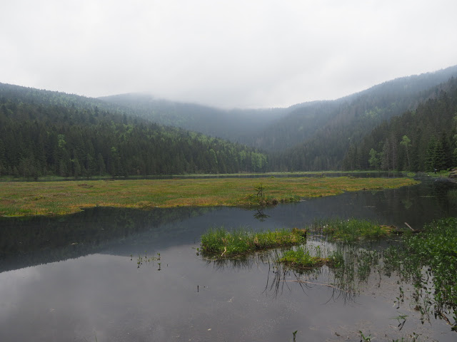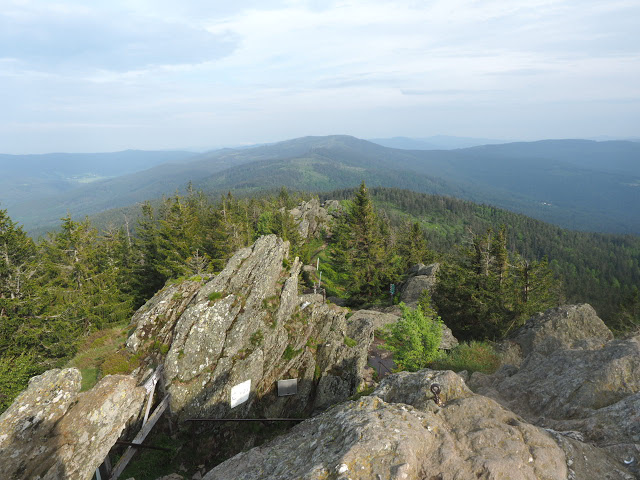 Nach längerem Aufstieg erreiche ich das Gipfelplateau des 1456 Meter hohen Arbers. Der Regen hat nachgelassen und so kann ich mich etwas umschauen. Eine Seilbahn führt hierauf, daher sind relativ viele Leute oben. Einige kleine Felsmassive gewähren weite Aussichten. Als ich dann weiter durch den Fichtenwald zum Kleinen Arber laufe, lasse ich die Menschen bald hinter mir. Es gibt hier ein 400 ha großes Naturschutzgebiet dass den Kleinen Arbersee mit einschließt. Teilweise ist der Wald recht schön, aber auch hier wird Borkenkäferbekämpfung betrieben. Auf dem schön gelegenen See schwimmen Schwingrasen und einige Besucher bevölkern die Ufer. Bald bin ich aber wieder allein und laufe durch wunderschönen Plenterwald, wahrscheinlich bäuerlicher Privatwald mit vielen dicken Tannen und Fichten, und relativ wenig Buchen. Der Wasserfall am Sollerbach wirkt besonders schön in der nach dem Regen leuchtend grünen Umgebung. Das sind hier wirklich weite Wälder, die nach meinem Gefühl sogar den Pfälzer Wald in den Schatten stellen. Der Ort Sommerau wirkt winzig vor dem Hintergrund der großen Wälder. Lohberg ist dagegen größer. Hinter dem Ort beginnt der lange Aufstieg auf den Großen Osser von 650 auf 1291 Meter Höhe auf schönem Pfad durch dichten Nadelwald. Am Kamm folge ich dann einer Felsbank aus Quarzit zum felsigen Gipfel, der schöne Aussichten bietet. Der Arber wirkt schon ziemlich weit entfernt…